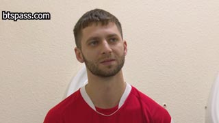 Hetero Denis is tied by the wrists and ankles so there's nothing he can do to cover his stark naked body. He's seething with anger because being put on sexual display like this for other men is a blow to his masculine pride. We're able to freely grope him all over and there's nothing he can do about it. Denis will do anything for revenge, but of course we won't keep any promises made. His dick grows achingly hard with some skilful stroking. That great big beast throbs as it's tightly bound. Having a giant weight attached to his genitals and stretching them is like a punch to the gut and Denis cries out from the excruciating pain. His warm back passage is extremely tight and we can feel him trying to protectively tighten it. It takes some vigorous stretching to get that arsehole to open. |