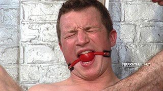Stark naked military man Mikel is fully restrained! The tough hetero's hands are bound and suspended behind his back, a ball gag is stuffed in his mouth with a head restraint and his legs are cuffed and spread. The furious bastard grunts and makes a futile struggle to break himself free. All the while his great big dick and balls dangle uselessly between his legs. Aaron seizes Mikel's cock and skilfully strokes it so the dumb lug can't stop himself growing thick and tumescent in a man's fist. Mikel is utterly humiliated that all it'd take is a bit more wanking to get him to spill his seed, but this isn't about his pleasure. Aaron uses his bare hand and a wicked strap to wallop Mikel's arse, disciplining the fucker until that bum burns painfully red. Drool shamefully pours from his spread mouth. |
