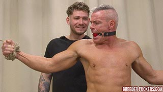 Aaron's got his landlord exactly where he wants him now! Roped by the wrists and ankles to the wall while the mature man's fit body is fully exposed except for a slutty little jock strap. He can freely run his hands over the straight man's muscles and the bastard can't even object to it because a bright red ball gag is stuffed in his gob. All Gavin can do is moan furiously and struggle against his binds. With just a quick snip the thin fabric falls to the floor and the hetero's sizeable cock and balls tumble out into the open. Aaron sprays oil over the naked man's body so it gleams all over and makes his muscles pop. While rubbing the grease over the man's rump he uses the opportunity to moisten Gavin's back passage so he's fully lubed up. Gavin's face goes red with seething anger at having his most intimate area ravaged. |