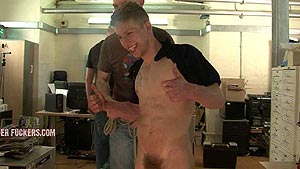 He's desperate to rub his sore bottom and it's agony to be unable to sooth himself. Bobby would do anything to stop more lashing – even suck a stiff prick that's presented in front of his face. Little does he know he's just prepping this cock to be inserted up his tight rectum. Crouched in this strained position with his head crushed flat against the pedestal while being ploughed in the behind is excruciating, demanding work. All hot young labourers should be put on dick sucking and arse slut duty after parading around in front of us all day with their arse cracks on show. Bobby takes a relentless fucking from both men till he's begging for mercy and his hole is screwed raw. That sweet little crack is drenched in sperm – as every builder's should! |