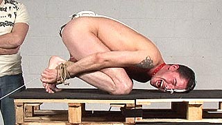 Mikel huffs in gruelling frustration as his body constantly tenses holding this same position. Aaron ups the stakes using a cane to punish Mikel's already sore arse cheeks. But Mikel must not physically react to the pain or the pressure of the hook tugging against his anus is increased. Instead he shouts beneath his gag straining to take it though every second feels like it stretches to an eternity. Aaron grabs Mikel's cock and persistently strokes it. Mikel's sex drive is so high he can't control his dick growing very rigid and so excited that his spunk shoots clear across the room! Aaron uses any sperm he can collect to pour down Mikel's arse crack to moisten the hetero's hole. A big fat dildo is used to ram all that creamy muck deep inside Mikel's arse. The irate bastard screams himself hoarse from the overwhelming humiliation and pain! |
