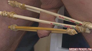 What a predicament Mike is in now. He can't move an inch how I've tied him - lashed to thick bamboo sticks, his legs held wide open, his hole just waiting to be fucked yet again. And I plan to have this cunt howling in pain as he serves me. I begin by binding his balls and clamping nasty clips to his foreskin and testicles, mercilessly leaving them on the tightest setting to make sure they hurt the delicate genital skin as much as possible. Mike begins moaning, but he hasn't felt real pain yet... I rope the clamps to the ceiling and secure them with a weight, causing him to plead with me not to hurt him. |