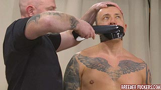 Konrad's entire body seizes in fury trying to resist but there's nothing he can do to stop this humming device mashing his innards. Drool shamefully pours out of his mouth. Dave waves the vibrator in front of Konrad's face so the bound hetero gets a strong whiff of his own arsehole. Konrad keeps angrily bucking about so to hold him in place a vicious anal hook is fixed up his bum and tied to his head gear. Now the fucker can't move an inch or it will cause him intense pain. The vicious captors test Konrad's will power by delivering painful whacks to that bare arse. It takes every last drop of Konrad's resolve not to thrash out and cause himself even more damage. Aaron grabs Konrad's dick and tugs on it like the masculine bastard is a fucking cow. His prick is insistently stroked so the dumb lug can't stop his sex drive being stimulated. Konrad groans as his balls are completely drained. Now all that spunk is used as lube for a great big dildo which is pounded up Konrad's arse so hard he screams beneath his gag!